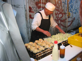 Spherical balls similar to the profile and toppings of okonomiyaki called takoyaki are filled with whole mini octopus! |