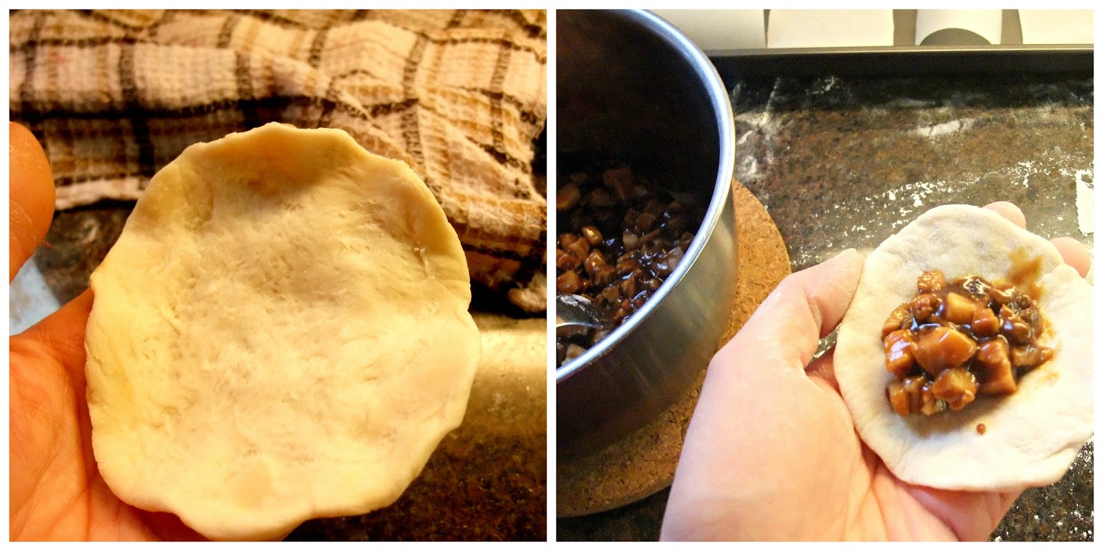 Now we are ready to assemble the buns: Press each piece of dough into a disc about 4-1/2 inches in diameter (it should be thicker in the centre and thinner around the edges). Working with one round at a time, place about one Tbsp. filling in the centre. Pleat right around the edge of the round by fluting and tugging upwards to create a pouch for the filling and more skin to pinch and twist at the top to close. Set the bun on each square parchment paper as they are bring made. Cover with damp cloth to keep buns from drying out.