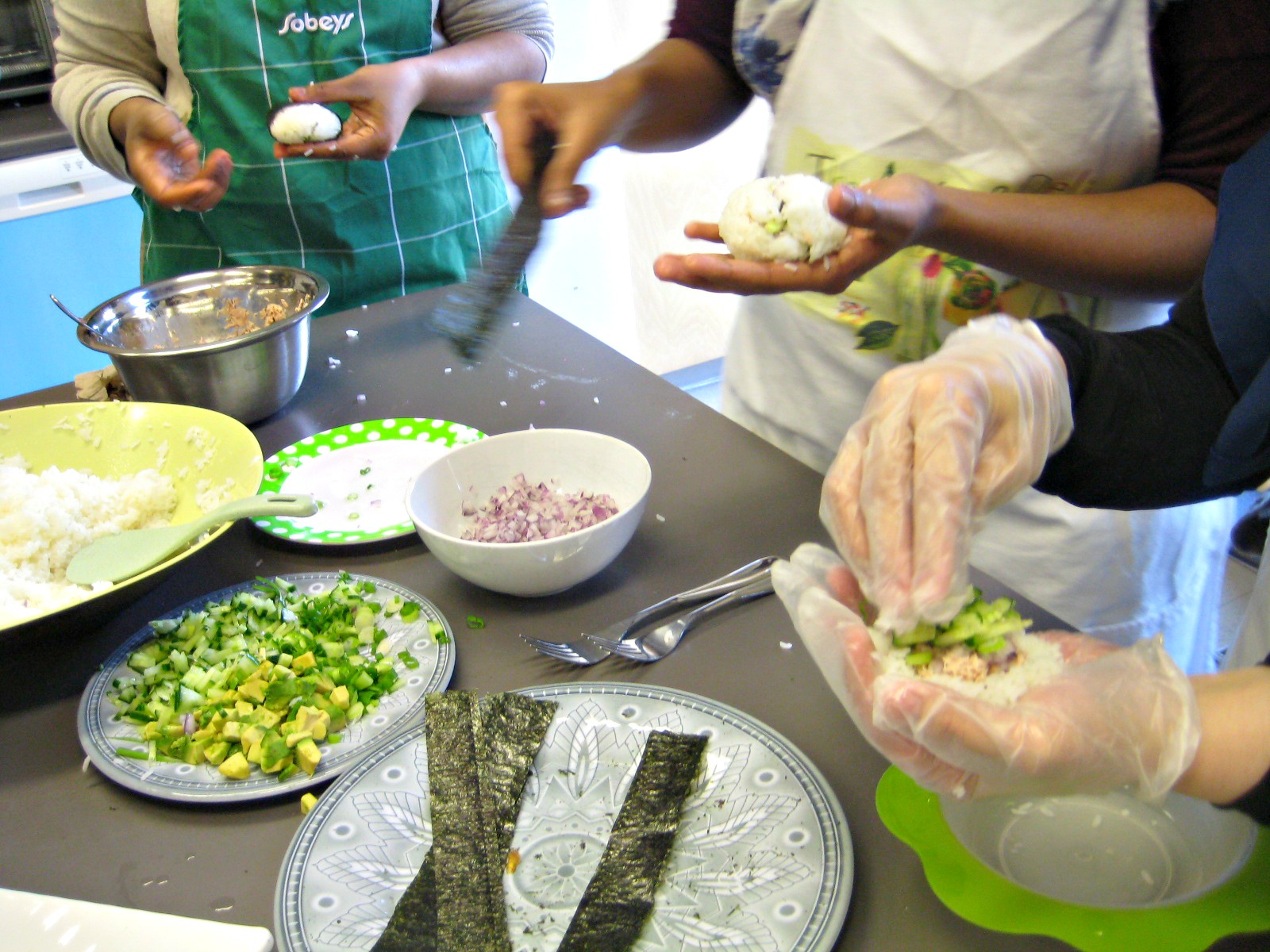 Demoing how to mould and shape onigiri rice balls.